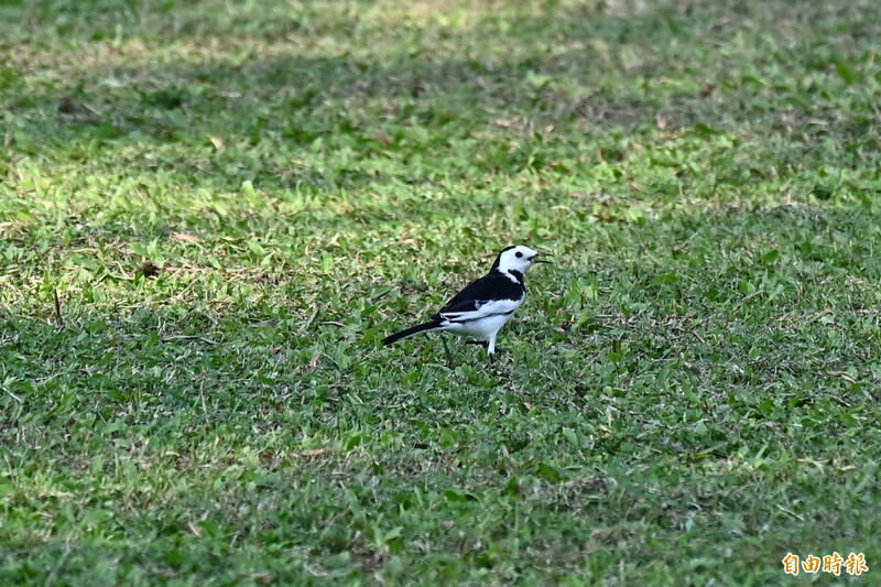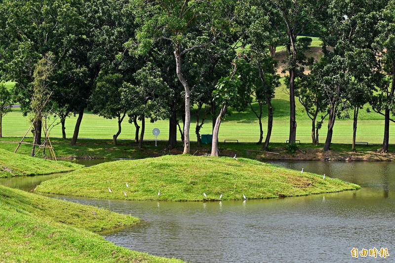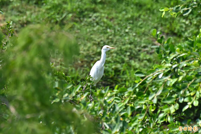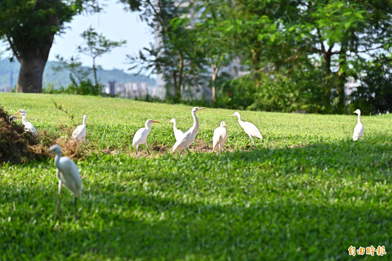 走在果嶺公園沿途會看到許多白鷺鷥在草地上悠然自得覓食昆蟲。(記者李惠洲攝)