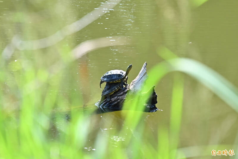 水池裡的烏龜攀在估木上曬起日光浴。(記者李惠洲攝)