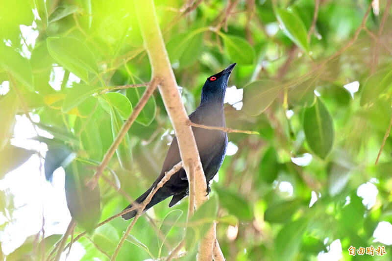 墨綠金屬黑,且有著紅眼睛號稱「紅眼戰士」的亞洲輝椋鳥也現蹤在果嶺公園內。(記者李惠洲攝)