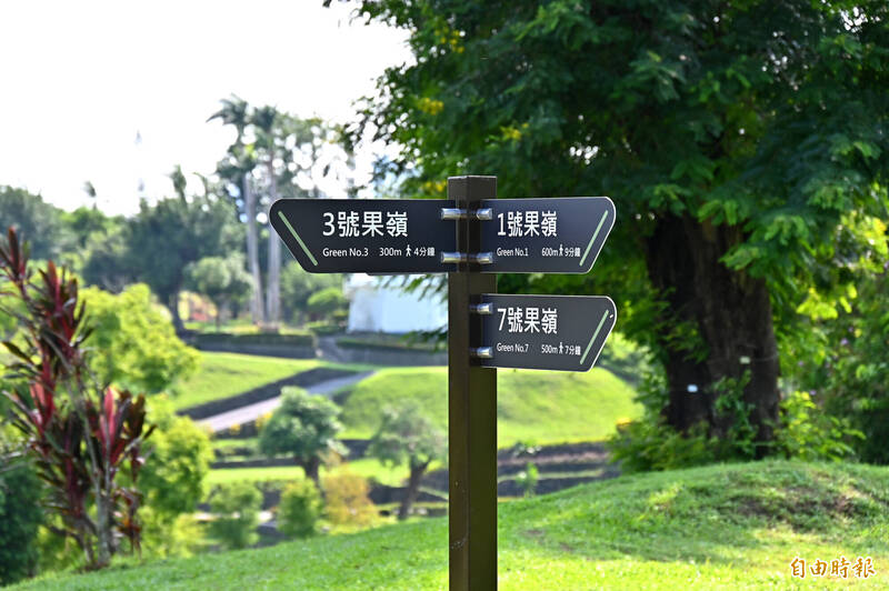 高雄果嶺自然公園擁有難得的70公頃綠地,保留原本高爾夫球場的丘陵、水塘與草原景觀,並規劃7.2公里以上的園區步道,以標準的高爾夫球場第1洞至第18個球洞全程走完大約需花費3個小時左右,腳程快的民眾約2個多小時,記者實際從第1洞全程走完到第18洞,每到一個果嶺就可以看見數字號碼指示牌,可了解自己目前是走到幾號洞口位置,也成為果嶺公園中特有的路標。