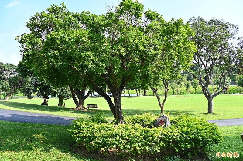 高雄果嶺自然公園內有顆種植超過60年的七里香,這顆巨大七里香見證了當時這座高爾夫球場的歷史過往,球場甚至還為此樹立了一個石碑來紀念。(記者李惠洲攝)