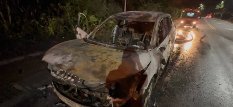〔記者林嘉東/新北報導〕新北市萬里區中福路鄰近基隆市上坡路段,今(11日)傍晚發生起火燒車意外。1輛租賃車上坡途中引擎室不斷冒煙,傅姓駕駛發現儀表亮燈顯示引擎故障,路過騎士見狀上前敲窗示警,車上4人趕緊把車停在路邊沒多久,整輛車就燒起來。新北消防隊獲報趕抵滅火,車子已遭火舌吞噬,還好4人緊急下車逃生,否則後果不堪設想。