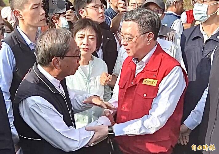 卓榮泰握著當地當地文山里長何中信雙手說,以後你要當「監工」喔,要求廚餘符合法規;何中信訴苦說,一天接到上百通百姓抱怨電話,空氣實在太臭了,消毒覆蓋木屑才改善。