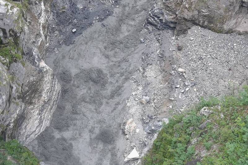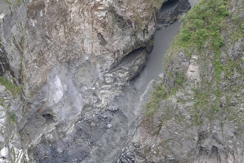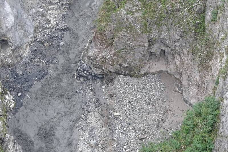 〔記者王錦義/花蓮報導〕燕子口堰塞湖前天啟動壩體降挖,但立霧溪上游集水區因發生降雨,造成壩體溢流水道水量擴大,今天中午左右發生壩體遭水流沖刷破壞壩體,引發立霧溪下游水位抬升,大水約持續快一個小時,最新堰塞湖空拍畫面曝光,可以發現壩體及堰塞湖幾乎消失不見,不過現場山壁仍持續有落石,燕子口仍是維持封閉。