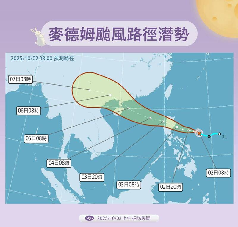 〔記者吳亮儀/台北報導〕中央氣象署在今天(2日)說明,上午8時,原位在菲律賓東方海面的熱帶性低氣壓已發展為輕度颱風,編號第21號,國際命名「Matmo」,中文譯名「麥德姆」,預測未來向西北西朝菲律賓移動,對台灣無直接影響。