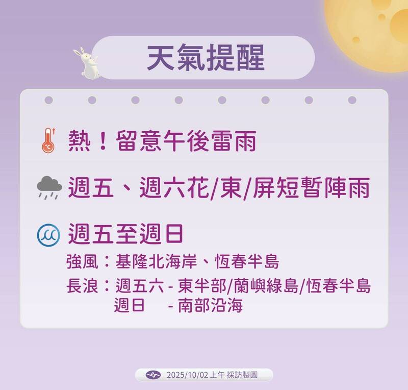 氣象署也提醒,今天(2日)各地及澎湖、金門、馬祖大多為晴到多雲,午後山區及高屏地區有零星短暫雷陣雨。氣象署也發布高溫資訊,今天白天台北市、新北市、台中市為橙色燈號,有連續出現36度高溫的機率,請加強注意;桃園市則為黃色燈號。