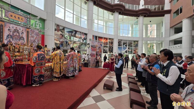 這場儀式在市府舉行可說前所未見,道壇香案齊備、鼓樂迴盪大廳,不少員工也虔誠跟著合十膜拜;也有人驚訝納悶從沒看過廟會宣傳辦到市府裡,認為應該選在台南祀典天后宮更為貼切。