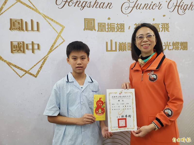 校長林季玲今天公開表揚江詠恩善行,獎勵他小功一支,還自掏腰包2千元鼓勵他,並請他分享當時心路歷程,藉此啟發更多學生在生活中落實關懷。
