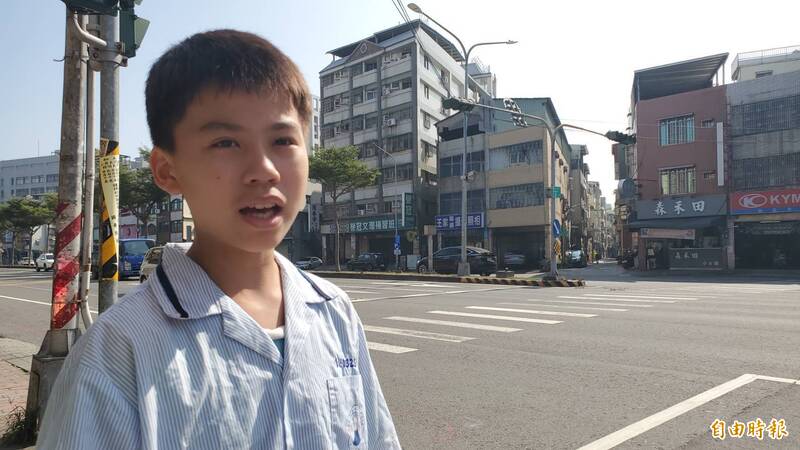 江詠恩品學兼優,溫暖又善良,昨天中午放學時,騎腳踏車陪同學回家,穿越鳳山區中山東路,突然看見一名阿伯行動不便,以雙手撐著身體辛苦過馬路,眼見行人號誌燈只剩下10多秒就要變成紅燈,阿伯還在路中間,且馬路很大、車子很多,擔心阿伯來不及過馬路會被車撞到。