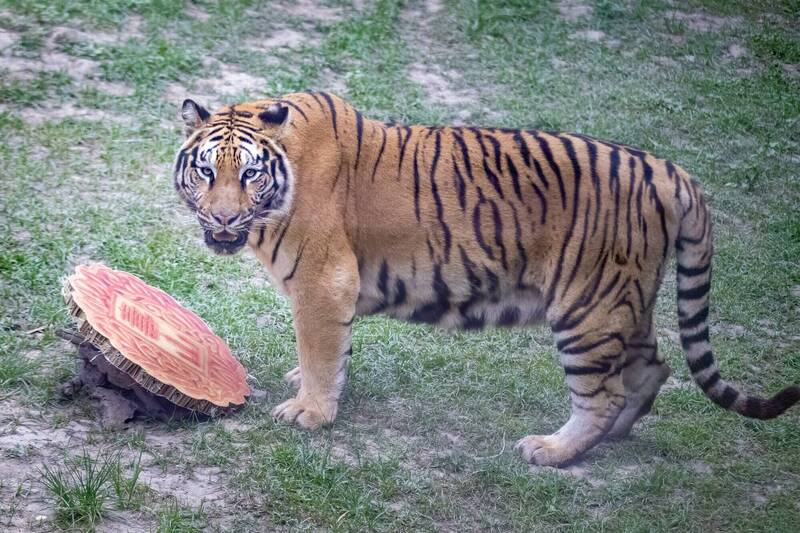 此外,狐獴的特製月餅需透過利爪挖取才能順利享用藏在月餅內的麵包蟲及大麥蟲,孟加拉虎的貓薄荷月餅則是使用回收瓦楞紙製作的圓形貓抓板,「二妞」及「阿生」立刻上前抓取玩樂。