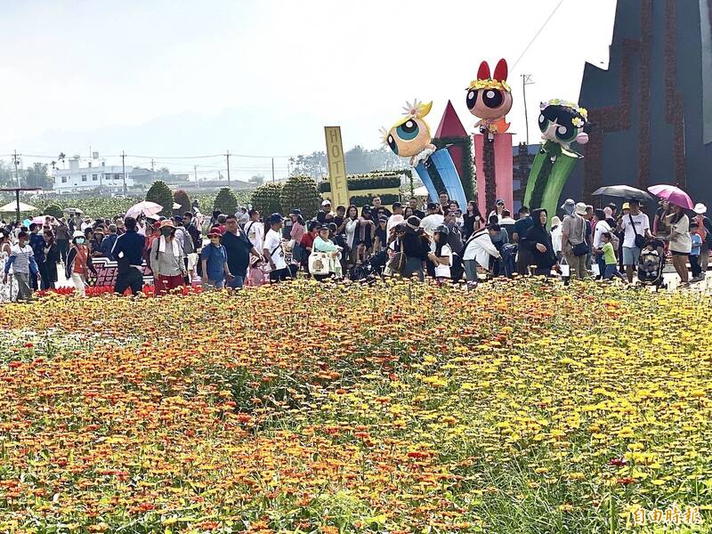 農業部種苗改良場在花海展出超過百種玫瑰,至於主花毯以卡通頻道「飛天小女警」為靈感,高18米號稱開辦以來最大,今天上午天氣涼爽晴朗,遊客扶老攜幼徜徉兩公頃花海,在步道中拍照欣賞百花爭豔,鄭姓遊客說,「感到心花特別開。」