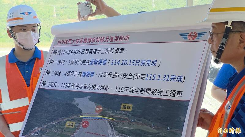 公路局也指出,涵管橋通車後,第二階段是鋼便橋的搶修,全長560公尺、橋寬12公尺,總經費4.3億元,將在本月15日發包,預計明年1月31日通車,鋼便橋不限車種通行;第三階段的馬太鞍溪新建將抬高橋梁、增加跨距減少落墩,強化橫向抗衝擊能力,預計今年底前發包、北上線2026年底完成、南下線2027年底完成。
