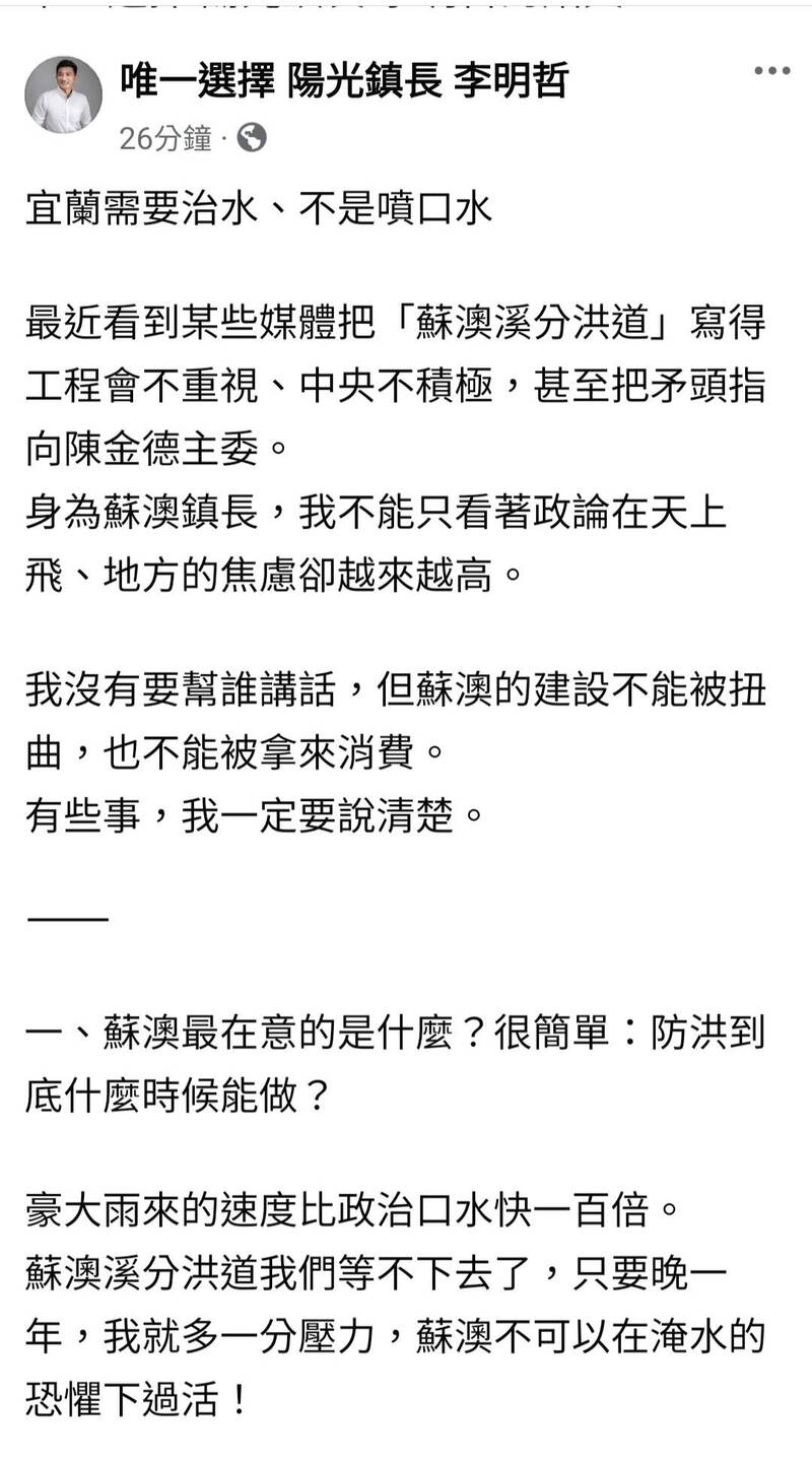 李明哲在個人臉書粉專發文說,最近看到某些媒體把蘇澳溪分洪道寫成行政院工程會不重視、中央不積極,甚至把矛頭指向工程會主委陳金德,他身為鎮長,沒有要幫誰說話,但蘇澳建設不能被扭曲,也不能被拿來消費,有些事一定要說清楚。
