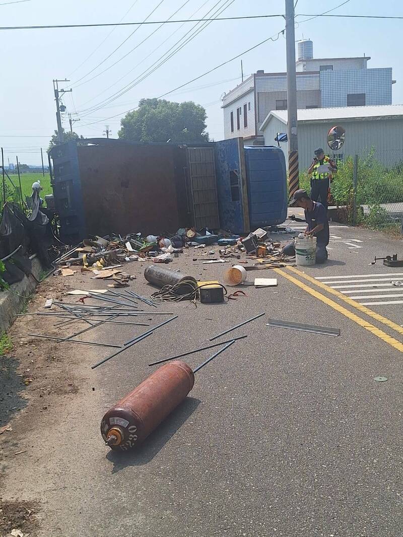 這起車禍發生於午間12點40分許,林男駕駛貨車載25歲江姓男子,沿上館七路南往北直行,與沿苗47線西往東直行的28歲雷姓男子所駕駛轎車於路口發生碰撞。撞擊力道猛烈,加上貨車被轎車攔腰撞上、導致翻覆,車上載運的瓦斯鋼瓶、工具、鐵件等物品散落一地,轎車車頭也毀損嚴重、駕駛座安全氣囊爆開。