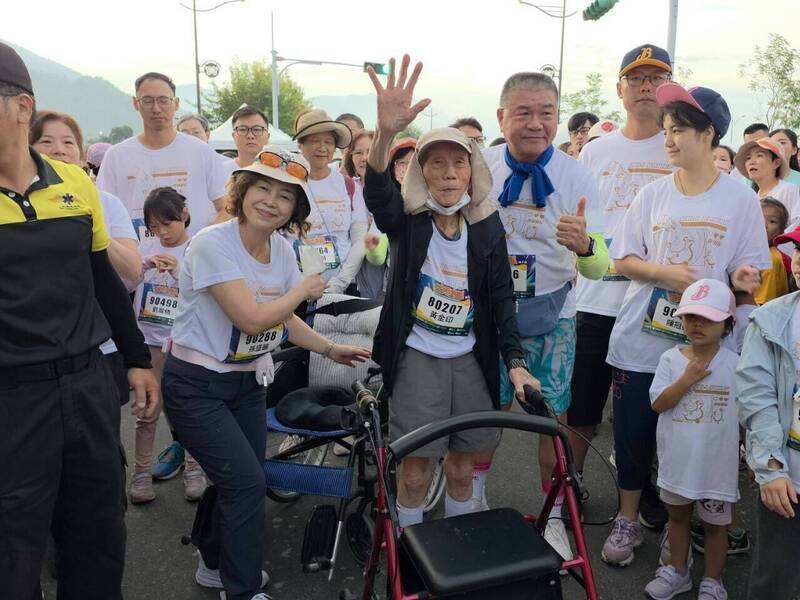 另在5公里的親子組中,則有百歲人瑞黃金印在家族子孫協助報名,並一路在身旁陪跑下,也完成人生首場馬拉松活動,開心直呼「金感謝」。