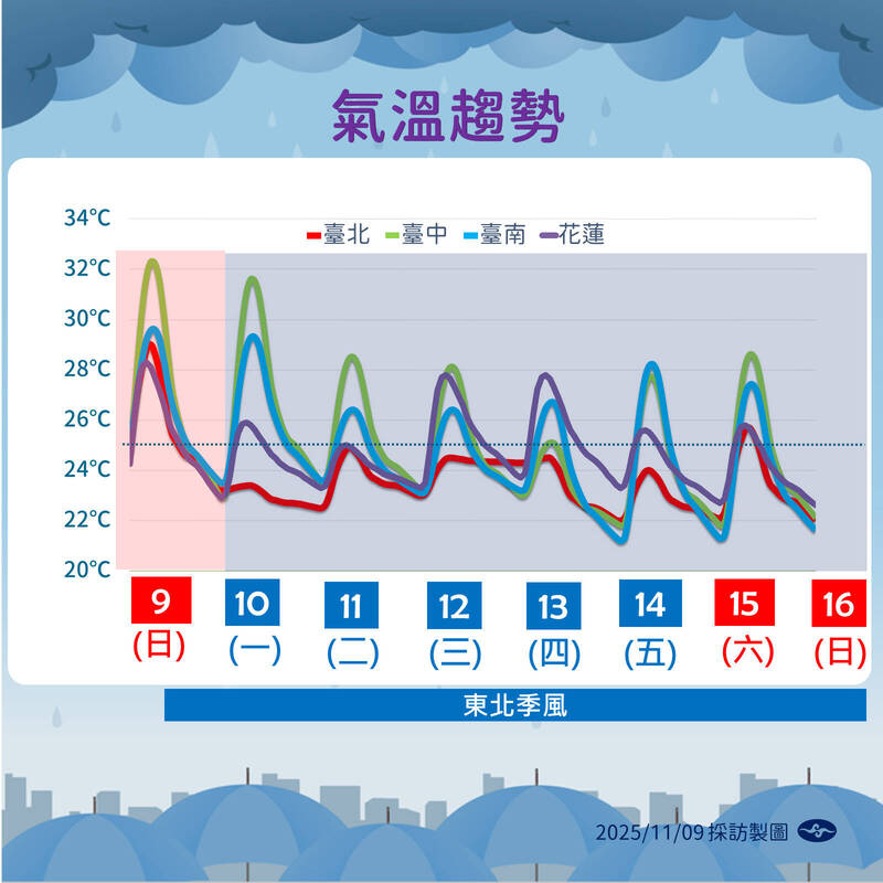 溫度方面,受東北季風影響,明起至下週日較涼。北部、宜蘭明起轉涼,整日落在22至25度;花蓮明起也降溫,未來1週白天約落在26至28度之間;中南部明天白天可至30至32度,週二開始降至28度左右。