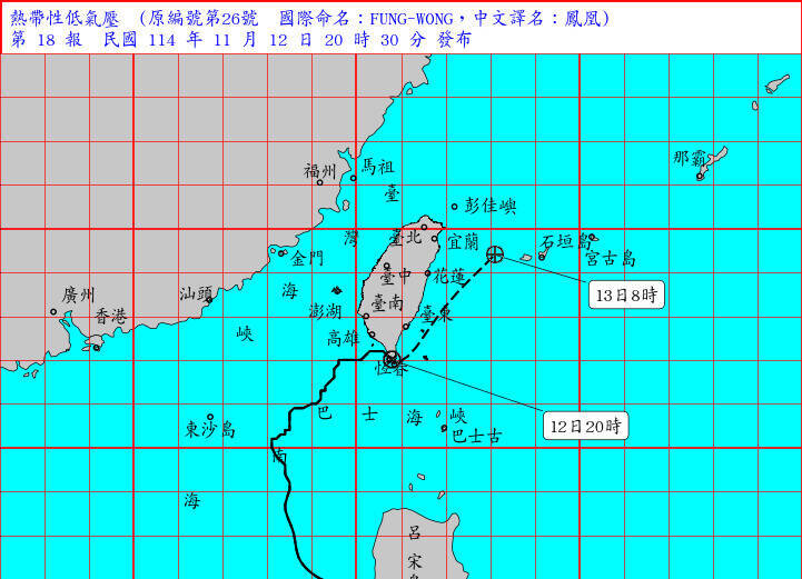 鳳凰颱風在登陸後很快減弱為熱帶性低氣壓,氣象署在20時30分解除海上陸上颱風警報。(取自氣象署官網)
