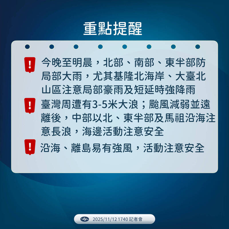 氣象署提醒,今晚至明晨北部、南部、東半部防局部大雨,尤其基隆北海岸、大台北山區注意局部豪雨及短延時強降雨。另外,沿海、離島也易有強風,活動要注意安全。