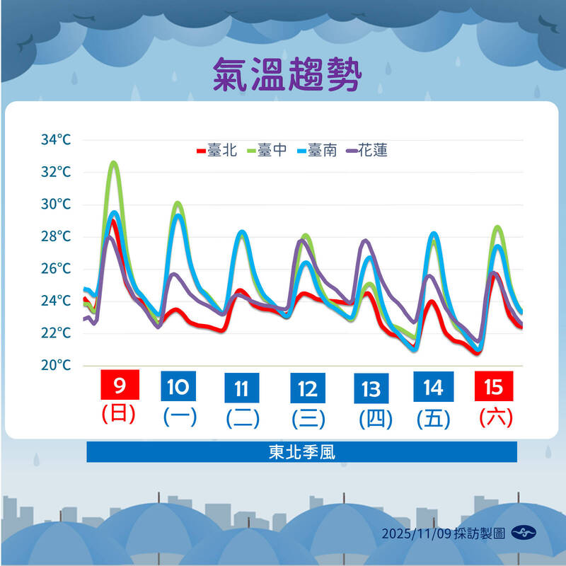 溫度方面,明天至週六受東北季風影響,各地降溫。北部明起轉涼,北部白天降至23、24度,早晚22度,週六下探近20度。花蓮明天偏涼23、24度,後半週24至26度;中南部明天白天可達30度,後續落在26至28度之間。