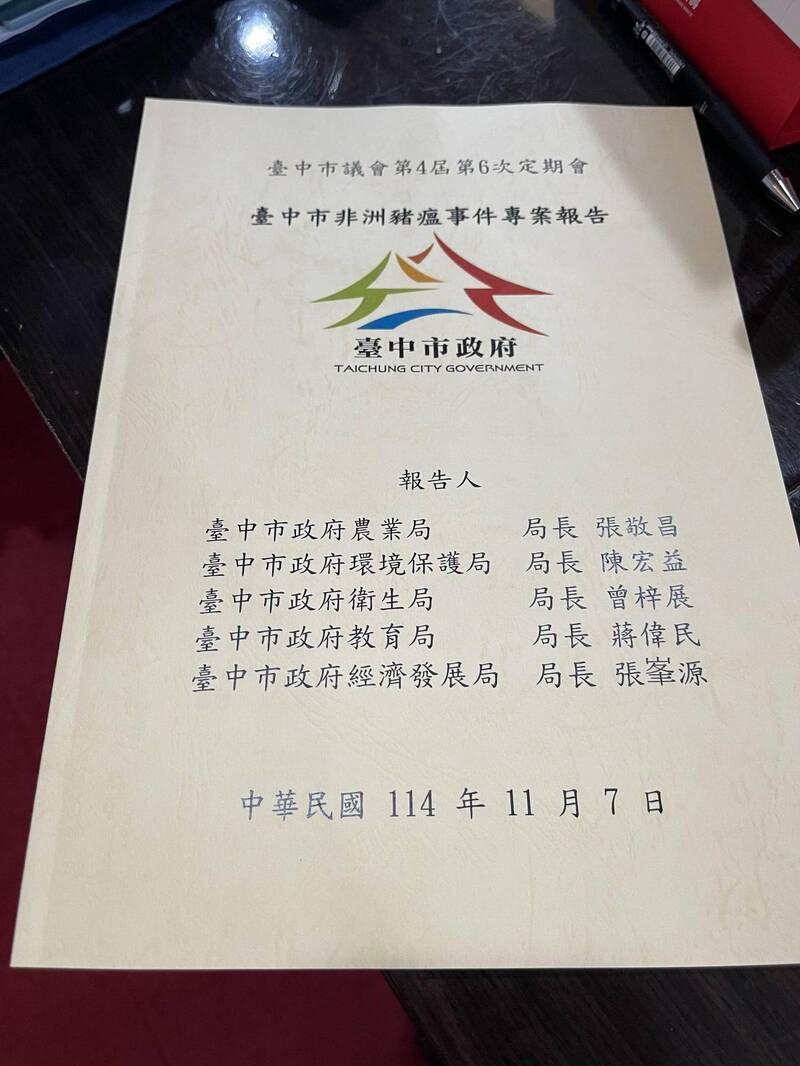 〔記者蘇孟娟/台中報導〕台中市10月22日爆非洲豬瘟,成台灣防疫破口,台中市政府今赴議會進行非洲豬瘟事件專案報告,但市府準備的專案報告書面資料上的報告人,竟是昨日已被免職的農業局長張敬昌、環保局長陳宏益,讓不少議員傻眼;台中市議員林德宇當場發飆,斥連這種事都做不好,市府藐視議會、規避監督究責;議長張清照則幫緩頰,「人員昨天才變」,今有附紙本公文補正與會代理人員。