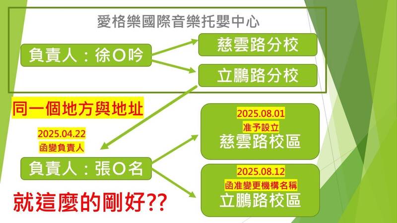 楊玲宜指出,這起女嬰因趴睡窒息不治事件發生在今年3月11日,但社會處當月25日才召開會議、27日第1次裁罰但仍讓業者持續招生、28日第2次裁罰後勒令停業,最後4月21日市府公布業者與負責人,沒想到隔天業者就申請變更負責人,8月12日市府就「函準變更名稱」,9月1日就正式更名。這樣巧合的時間點讓人起疑,質疑市府不但包庇縱容業者,也沒有進行實質的審查,更無確認原本的負責人所擁有的兩間分所,同時轉給另一個負責人,質疑業者是借殼上市、重起爐灶?更批市府沒有掌握相關進度,也沒有該有的敏感度,市府的行政處分形同廢紙。