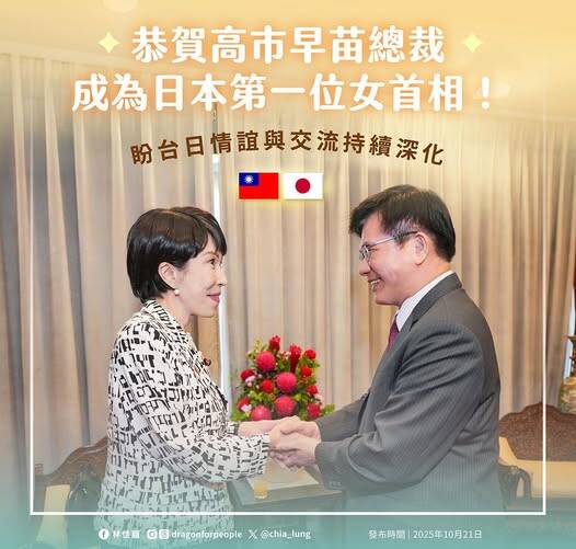 〔記者黃靖媗/台北報導〕高市早苗正式當選日本首位女首相。外交部長林佳龍今(22)日表示,對日本新政府的政策方向很有信心與期待,期待台日針對經濟安全、非紅供應鏈等面向緊密合作。