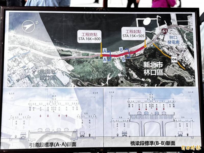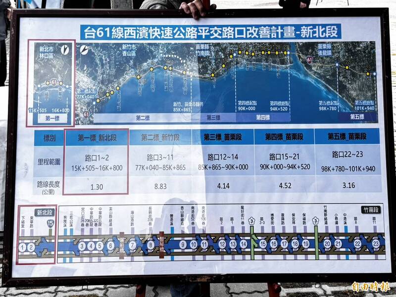 林福山說,路口改善採高架立體化,提升台61主線、強化分擔國道1號、國道3號車流。這次由第一標新北段開始動工,總工程經費逾13.4億元,預計2028年8月29日完工。新北段高架跨越下福里、東華路2處路口,橋梁上配置雙向4車道,橋下規劃庇護島、雙色路燈及自行車道等休憩空間,不僅提升用路人安全、車輛通行可減省15分鐘,肇事件數每年約可減少38%。