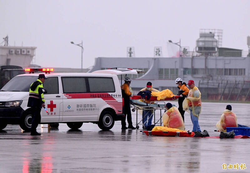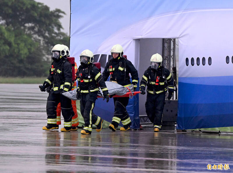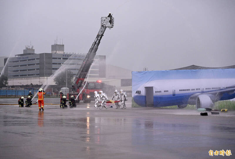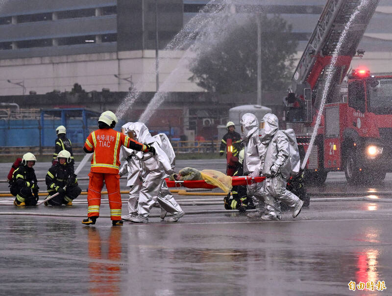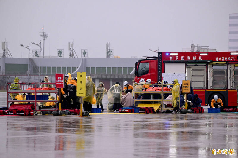 桃園國際機場公司今天辦理「114年度空難災害防救演習」,模擬客機降落後因液壓系統故障衝出跑道,引發火警並造成旅客受困,消救單位迅速投入滅火、搶救及旅客疏散。(記者朱沛雄攝)