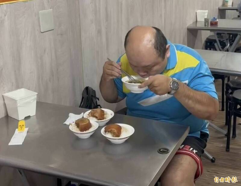 有民眾一口氣點3碗爌肉飯大口狂吃。(記者湯世名攝)