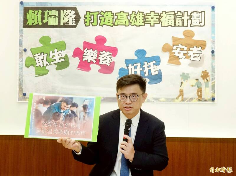 賴瑞隆今天在立法院召開記者會,指出高雄面對少子化與超高齡社會雙重挑戰,因應國際企業進駐可能帶來的新興人口趨勢.須超前部署做好準備。他以「敢生、樂養、好托、安老」為政見核心,提出社福藍圖。