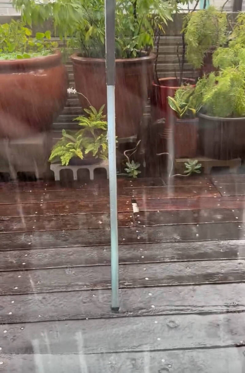 「現主時(現在)竟然下小冰雹欸」,網友wc在脆(Threads)發布錄影訊息指出,今天傍晚約5時40分許,大里區德芳及爽文路一帶竟然天降冰雹,大小顆冰晶隨雨勢傾瀉而下,墜落在庭院木地板到處跳動,從沒看過這種景象。