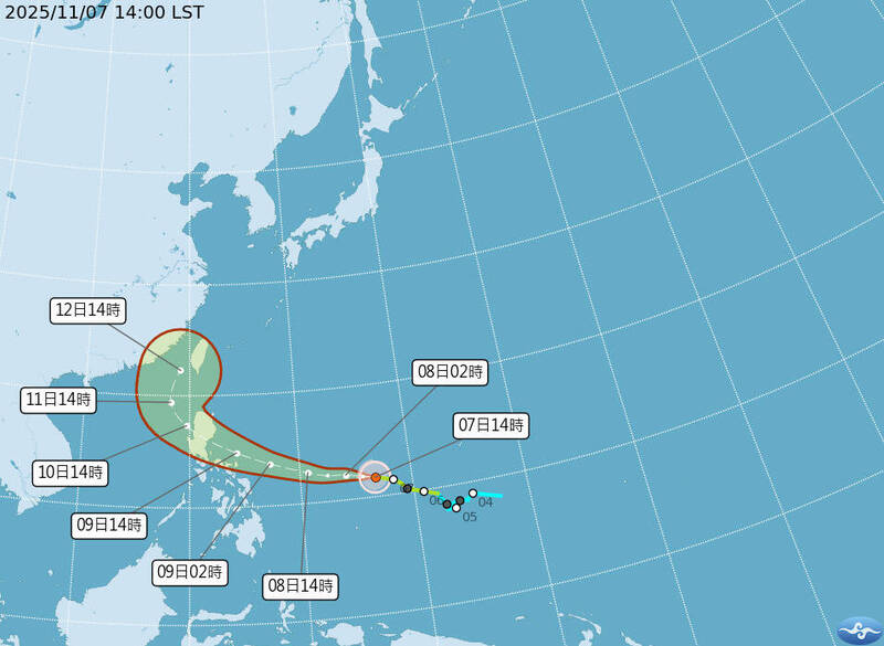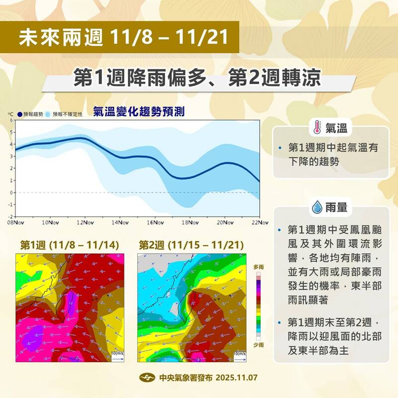 氣象署今天也發布未來兩週的「月長期天氣展望」,模式預測未來兩週主要為東北季風影響的天氣型態,降雨以迎風面的北部及東半部為主,但第一週(11月8日~11月14日)受颱風及其外圍環流影響,各地都有陣雨,並有大雨或局部豪雨發生的機率,東半部降雨訊號顯著。