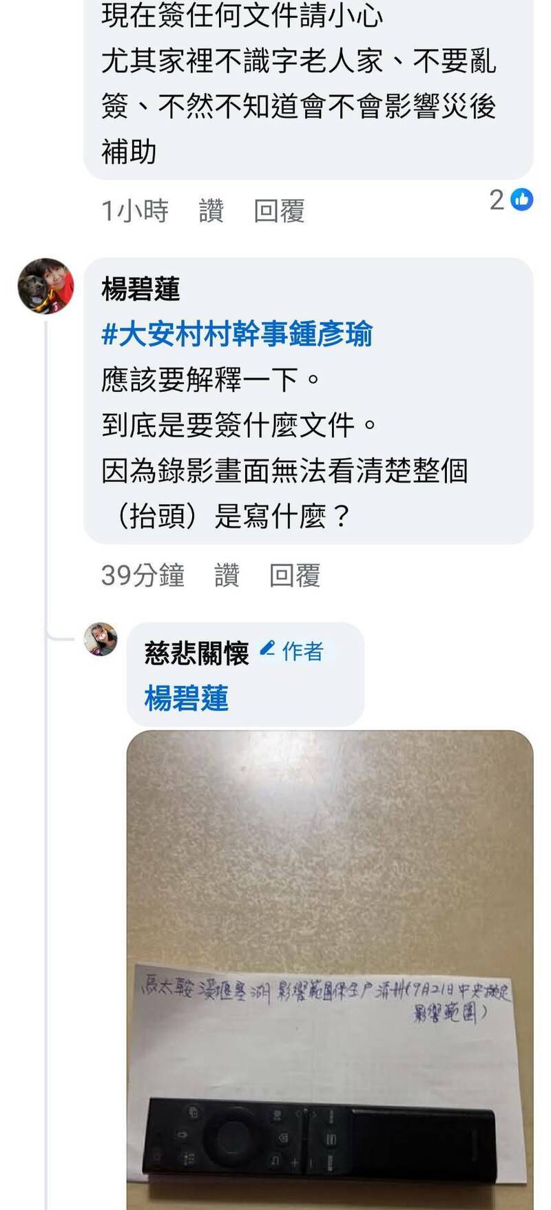 有災民認為這是涉及偽造文書的犯罪行為,已將影片向鳳林警分局檢舉,影片內容裡鄰長還涉及調查人在台北工作的災民女兒相關年籍資料,並強調是村幹事交付,只是照做而已,根本不知道用途。