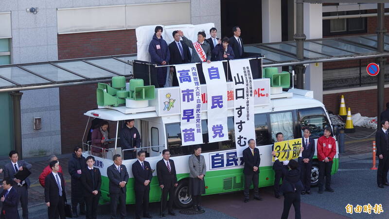 高市助講時表示,她在擔任總務相時因業務需要,就常與當時擔任官房長官菅義偉秘書官的山口晉接觸,受到很多的協助。高市今天到場時,山口晉正在宣傳車向選民進行最後的拜票訴求,聲音都喊到沙啞,高市在一旁也毫無保留地露出慈母般的笑容。