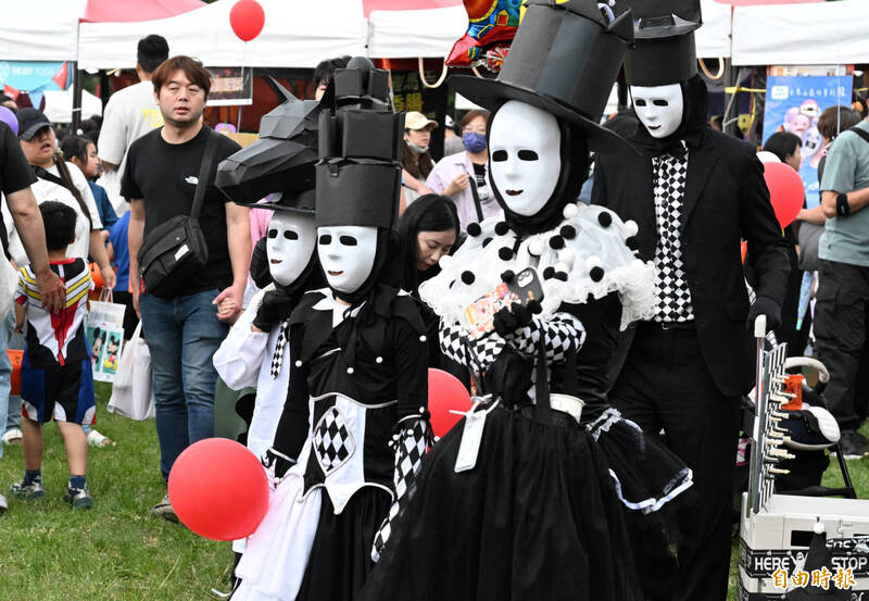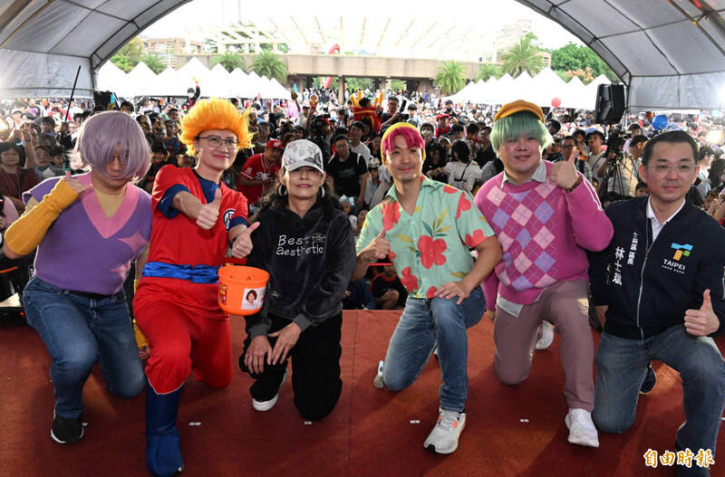 〔記者孫唯容/台北報導〕「天母搞什麼鬼17」萬聖節嘉年華活動今(1)日盛大舉行,現場擠爆參與變裝活動的大小朋友,盡情投入這場全民搞鬼的節慶派對。台北市長蔣萬安也盛裝出席,和產業發展局長陳俊安、商業處長高振源等人,打扮成動畫電影《Kpop獵魔女團》中的男團Saja boys,讓全場嗨翻。蔣萬安表示,自己今天扮演很新潮的動畫人物Saja boys的成員-Abby,小朋友應該都很認識這個角色,像自己兒子就很喜歡。不少民眾鼓催蔣萬安現場來一段Saja boys的熱門舞蹈Soda Pop,造型亮眼吸睛,引發討論。